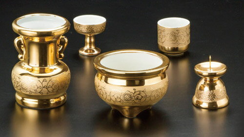 金唐草 (仏花) 金唐草 (香炉 ) 金唐草 (線香立) 金唐草 (ろうそく立) 金唐草 (仏飯器 ) 金唐草 (茶湯器) 5011円 2765円 3802円 2765円 1728円 1521円 1210円 1020円 1210円 1020円 9.5cm7.5cm12cm9.5cm5cm4.5cm6cm4.5cm6cm4.5cm 13cm10.5cm8.5cm6.5cm11.5cm5cm6.5cm5cm6.5cm4.5cm サクラ陶器のショーケース 洋食器 炊飯鍋 ・ 土鍋 (直火 & IH)・ゆきひら・煎じ土瓶・オーブン食器 カスター & そば食器 & 和食器 & 酒器 Sスタイル & キッズ & 甕 & すり鉢 & その他商品【日本製の神仏器・すり鉢・煎じ土瓶・ほうろく・乳鉢・甕・傘立など特殊な陶器のコーナーです】何時でも買い足しができるオープンストック サクラ陶器の食器はプロの料理人が使う、プロ仕様の食器です 下記の 神仏具 煎じ土瓶 ほうろく すり鉢 乳鉢 絞り器 おろし器 甕 傘立 ぺったんハウス ペットフードボウル 固形燃料 など特殊な商品を用意しています 信楽焼のつくばい・傘立 乳鉢・レモン絞り・おろし器・かめ・ペットフードボウル・オカリナ 神仏器 【本金仕上げ・純国産のこだわりの仏具】 ●国内工房にて丁寧に塗り焼き付けされた本格的仏具。