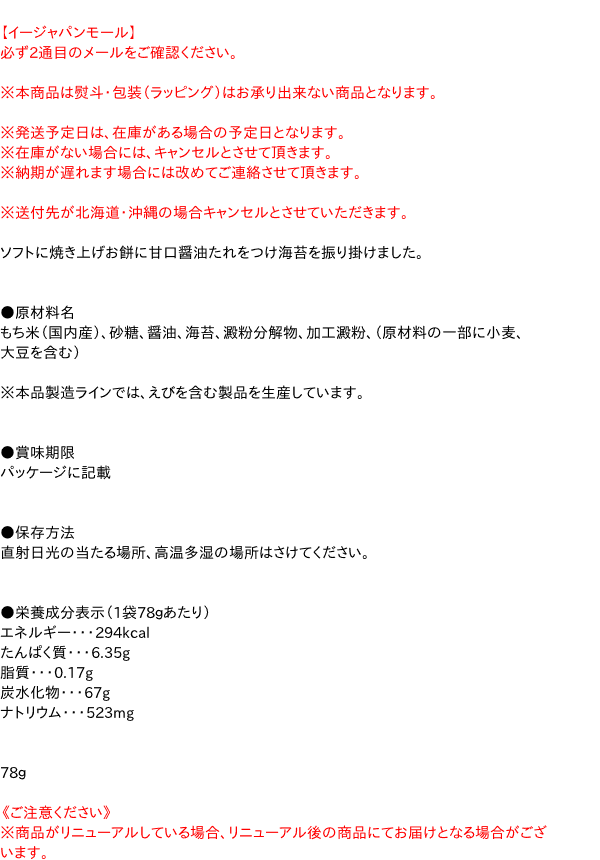 ●原材料名 もち米(国内産)、砂糖、醤油、海苔、澱粉分解物、加工澱粉、(原材料の一部に小麦、大豆を含む) ※本品製造ラインでは、えびを含む製品を生産しています。