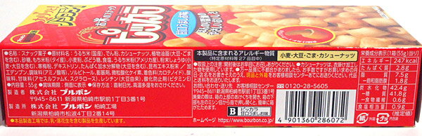 ●栄養成分(1箱(55g)当り) エネルギー・・・247kcal たんぱく質・・・2.8g 脂質・・・7.5g 炭水化物・・・42.4g 糖質・・・41.8g 食物繊維・・・0.6g 食塩相当量・・・0.9g 55g【メーカー・製造または販売元】株式会社 ブルボン0120-28-5605【広告文責】株式会社イージャパンアンドカンパニーズ 072-875-6666《ご注意ください》 ※商品がリニューアルしている場合、リニューアル後の商品にてお届けとなる場合がございます。